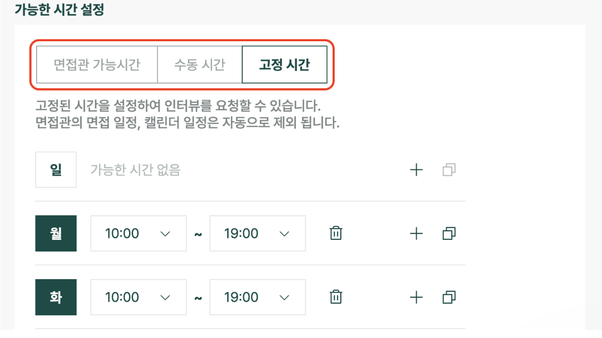 * 면접관 캘린더 연결 없이 인터뷰 가능 시간을 다양한 방법으로 설정할 수 있어요.