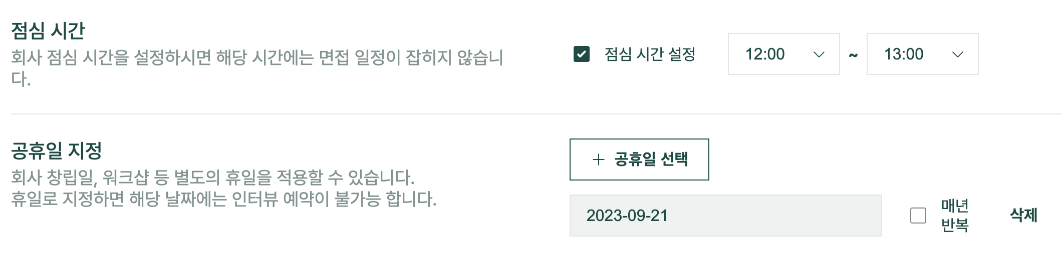 * 공휴일을 지정하여 면접이 잡히 않도록 해줍니다.&#x20;